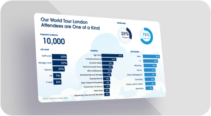 Job Level Staff Level 33% Manager Level 31% Director 23% VP 7% C Level 6% Relationship Our World Tour London Job Function Sales 29% Attendees are One of a Kind IT 25% 25% 75% Marketing 16% Prospects Customers Service 7% Projected Audience General Management 7% Consulting 6% 10,000 Operations 4% Finance, Admin & Other 6% Job Level Industries Job Function Industries High Tech 30% 29% Sales High Tech 30% Staff Level 33% Professional Services 14% Professional Services 14% IT 25% Comms & Media 10% Comms & Media 10% Manager Level 31% Retail & Consumer Goods 9% Marketing 16% NGO and Education 8% Retail & Consumer Goods 9% 31% 23% Manufacturing, Auto & Energy 7% Director Service 7% NGO and Education 8% Financial Services 6% Manufacturing, Auto & Energy 7% Travel Transport & Hospitality 6% General Management 7% VP 7% Healthcare & LifeSciences 4% Financial Services 6% Consulting 6% Public Sector 3% C Level 6% Travel Transport & Hospitality 6% Engineering, Construction & Real Estate 3% Finance, Admin & Other 6% Healthcare & Life Sciences 4% Operations 4% Public Sector 3% Engineering, Construction & Real Estate 3% Source: World Tour London 2023