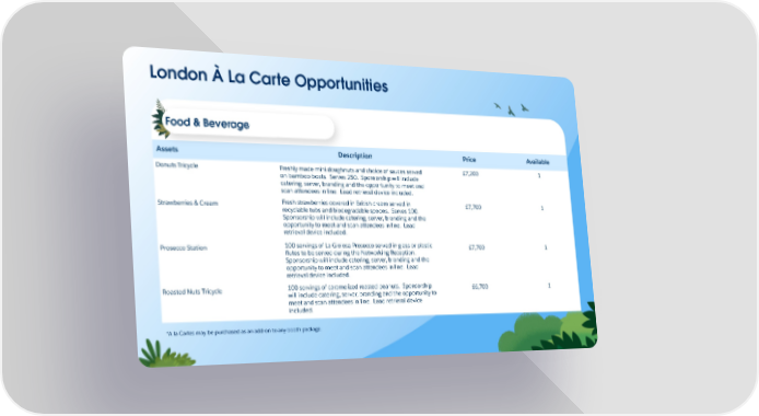 London À La Carte Opportunities Food & Beverage Assets Description Price Available Donuts Tricycle Freshly made mini doughnuts and choice of sauces served £7,200 1 on bamboo boats. Serves 250. Sponsorship will include catering, server, branding and the opportunity to meet and scan attendees in line. Lead retrieval device included. Fresh strawberries covered in British cream served in Strawberries & Cream £7,700 1 recyclable tubs and biodegradable spoons. Serves 100. Sponsorship will include catering, server, branding and the opportunity to meet and scan attendees in line. Lead retrieval device included. 100 servings of La Gioiosa Prosecco served in glass or plastic Prosecco Station £7,700 1 flutes to be served during the Networking Reception. Sponsorship will include catering, server, branding and the opportunity to meet and scan attendees in line. Lead retrieval device included. 100 servings of caramelized roasted peanuts. Sponsorship Roasted Nuts Tricycle £6,700 1 will include catering, server, branding and the opportunity to meet and scan attendees in line. Lead retrieval device included. *A la Cartes may be purchased as an add-on to any booth package.