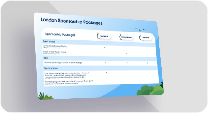 London Sponsorship Packages NAVIGATOR INNOVATOR GROUNDBREAKER Sponsorship Packages Event Access (1) 20 minute Breakout Session ◉ (ability to scan during session) (1) 20 minute Theater Session ◉ (ability to scan during session) Web Clickable sponsor logo inclusion on event webpage ◉ ◉ ◉ Meeting Space Host customers and prospects in a private room in the London ◉ Suite. The London Suite is located adjacent to the lower campground and provides boardroom seating for 20. Branded signage and basic audio visual is included. Catering and additional audio visual at Sponsors expense.