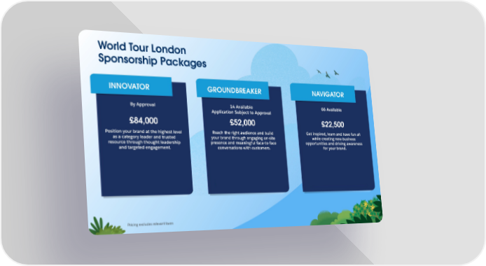 World Tour London Sponsorship Packages INNOVATOR GROUNDBREAKER NAVIGATOR 14 Available 66 Available By Approval Application Subject to Approval £84,000 £52,000 £22,500 Position your brand at the highest level Reach the right audience and build Get inspired, learn and have fun all as a category leader and trusted your brand through engaging on-site while creating new business resource through thought leadership presence and meaningful face-to-face opportunities and driving awareness and targeted engagement. conversations with customers. for your brand. Pricing excludes relevant taxes