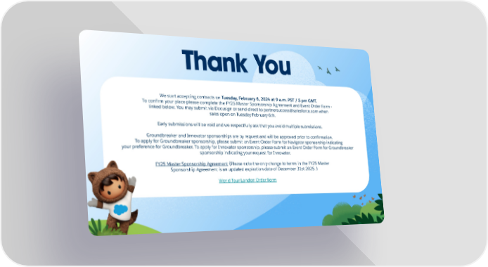We start accepting contracts on Tuesday, February 6, 2024 at 9 a.m. PST / 5 pm GMT. To confirm your place please complete the FY25 Master Sponsorship Agreement and Event Order Form - linked below. You may submit via Docusign or send direct to partnersuccess@salesforce.com when sales open on Tuesday February 6th. Early submissions will be void and we respectfully ask that you avoid multiple submissions. Groundbreaker and Innovator sponsorships are by request and will be approved prior to confirmation. To apply for Groundbreaker sponsorship, please submit an Event Order Form for Navigator sponsorship indicating your preference for Groundbreaker. To apply for Innovator sponsorship, please submit an Event Order Form for Groundbreaker sponsorship indicating your request for Innovator. FY25 Master Sponsorship Agreement (Please note the only change to terms in the FY25 Master Sponsorship Agreement is an updated expiration date of December 31st 2025. ) World Tour London Order Form